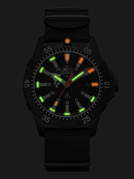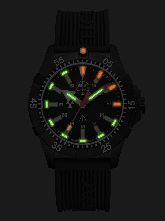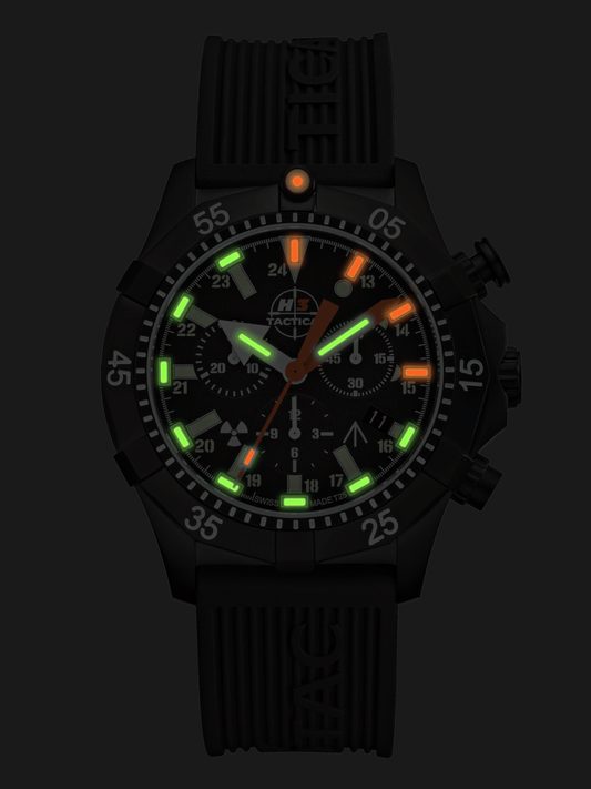 H3TACTICAL Commander Diver H3 Uhren sind robuste Armbanduhren mit PVD-beschichteten Edelstahlgehäuse. Sie sind mit einem kratzfesten Saphirglas ausgestattet, 200m wasserdicht und besitzen ein klar gestaltetes Zifferblatt. Mit der permanenten schweizer H3-GTLS Beleuchtung trigalight® wird das Zeitablesen auch bei Dämmerung und Dunkelheit ermöglicht. H3TACTICAL Commander Uhren sind als 3-Zeiger Modell mit Datum, als Chronograph mit Stoppuhrfunktion und als GMT-Version mit zweiter Zeitzonenanzeige, sowie mit verschiedenen Bandausführungen erhältlich. H3TACTICAL Commander Uhren werden von Polizei, Militär, Feuerwehr und Rettungsdienst, wie auch von Outdoorbegeisterten getragen und sehr geschätzt.