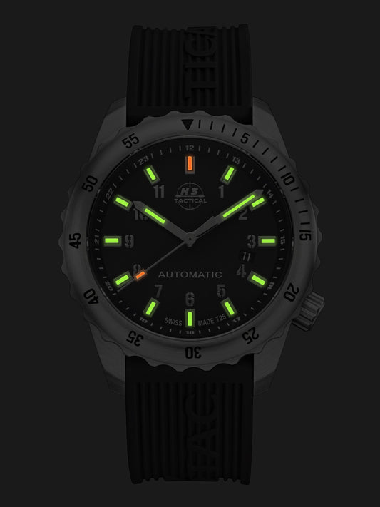 H3TACTICAL S.W.A.T. Diver Automatik H3 Uhren sind robuste Armbanduhren mit Edelstahlgehäuse. Sie sind mit einem kratzfesten Saphirglas ausgestattet, 100m wasserdicht und besitzen ein klar gestaltetes Zifferblatt. Mit der permanenten schweizer H3-GTLS Beleuchtung trigalight® wird das Zeitablesen auch bei Dämmerung und Dunkelheit ermöglicht. H3TACTICAL S.W.A.T. Diver Automatikuhren sind als 3-Zeiger Modell mit Datum und mit verschiedenen Bandausführungen erhältlich. Diese Militäruhr ist mit einem hochwertigen schweizer Automatikwerk ausgestattet. H3TACTICAL S.W.A.T. Diver Automatikuhren werden von Polizei, Militär, Feuerwehr und Rettungsdienst, wie auch von Outdoorbegeisterten getragen und sehr geschätzt.