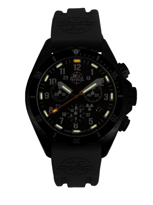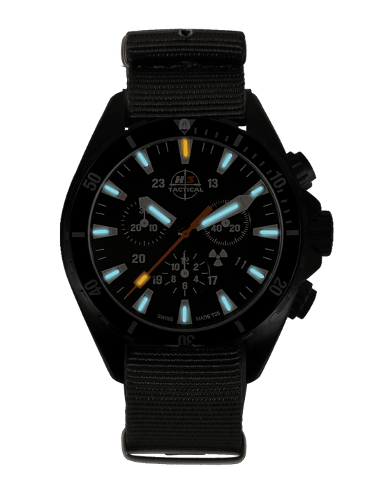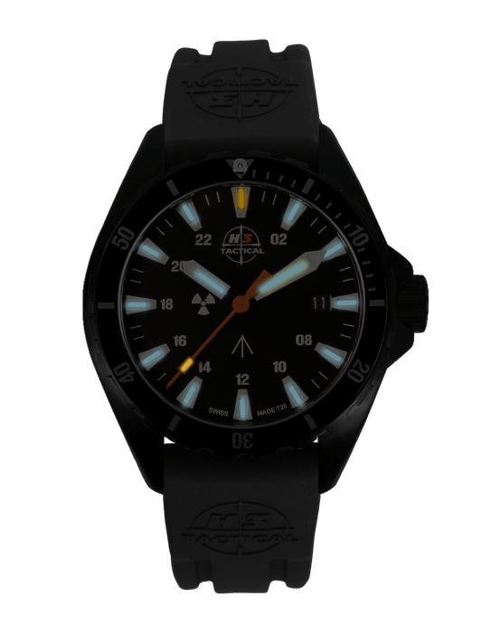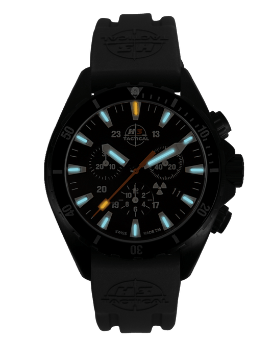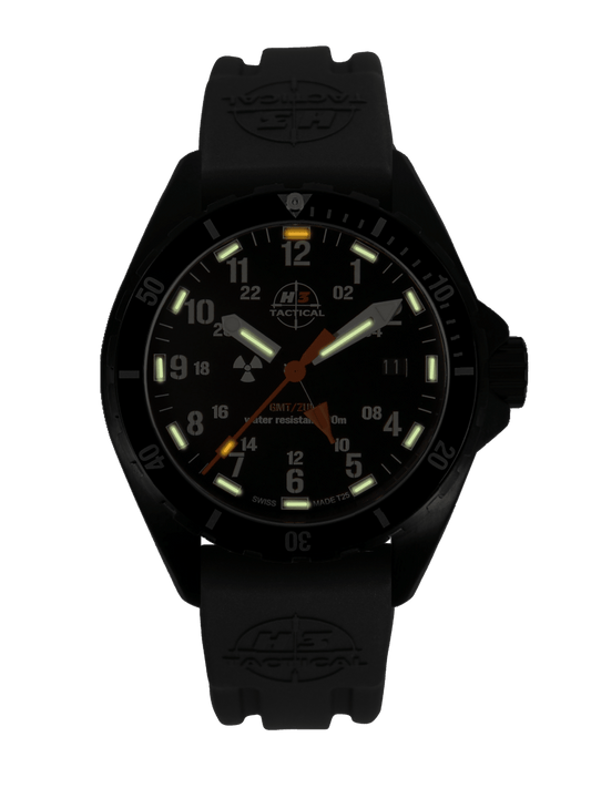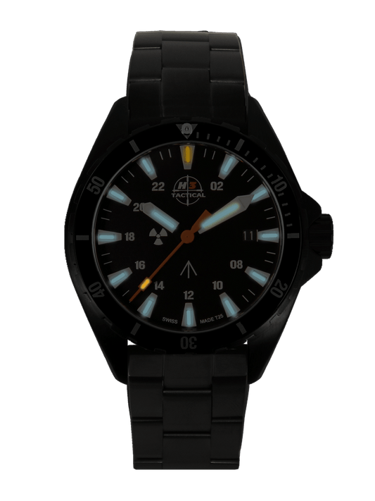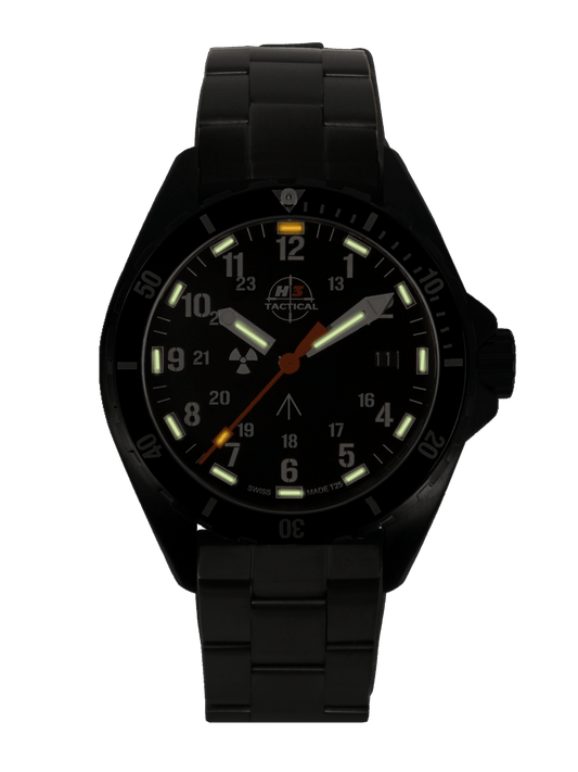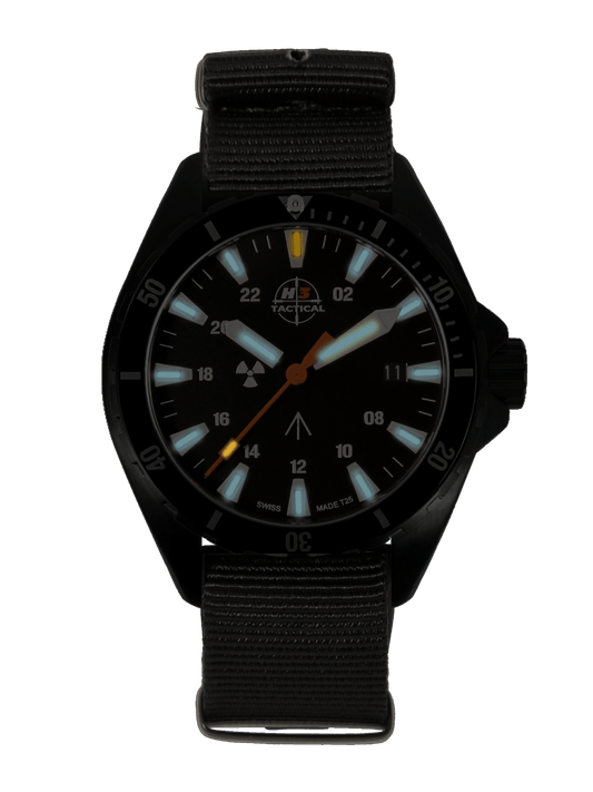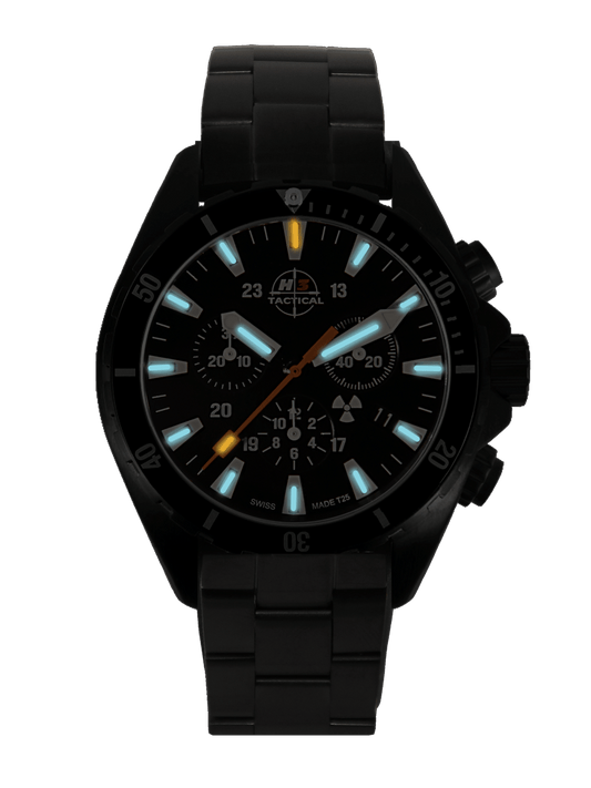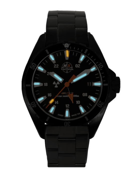 H3TACTICAL Trooper Diver H3 Uhren sind robuste Armbanduhren mit PVD-beschichteten Edelstahlgehäuse. Sie sind mit einem kratzfesten Saphirglas ausgestattet, 100m wasserdicht und besitzen ein klar gestaltetes Zifferblatt. Mit der permanenten schweizer H3-GTLS Beleuchtung trigalight® wird das Zeitablesen auch bei Dämmerung und Dunkelheit ermöglicht. H3TACTICAL Trooper Diver Uhren sind als 3-Zeiger Modell mit Datum, als Chronograph mit Stoppuhrfunktion und als GMT-Version mit zweiter Zeitzonenanzeige, sowie mit verschiedenen Bandausführungen erhältlich. H3TACTICAL Trooper Diver Uhren werden von Polizei, Militär, Feuerwehr und Rettungsdienst, wie auch von Outdoorbegeisterten getragen und sehr geschätzt.